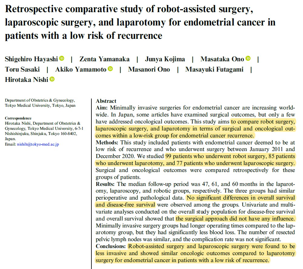 Hayashi S, Yamanaka Z, Kojima J, Ono M, Sasaki T, Yamamoto A, Ono M, Futagami M, Nishi H. Retrospective comparative study of robot-assisted surgery, laparoscopic surgery, and laparotomy for endometrial cancer in patients with a low risk of recurrence. J Obstet Gynaecol Res. 2024 Jan;50(1):103-112.