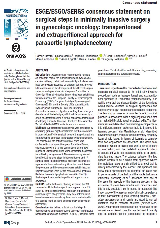 Rovira R, Mereu L, Planchamp F, Falconer H, El-Balat A, Barahona M, Fagotti A, Querleu D, Taskiran C. ESGE/ESGO/SERGS consensus statement on surgical steps in minimally invasive surgery in gynecologic oncology: transperitoneal and extraperitioneal approach for paraaortic lymphadenectomy. Int J Gynecol Cancer. 2024 Sep 24:ijgc-2024-005796.