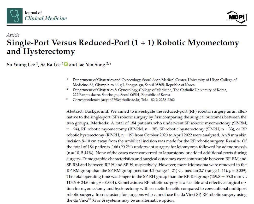 Lee SY, Lee SR, Song JY. Single-Port Versus Reduced-Port (1 + 1) Robotic Myomectomy and Hysterectomy. J Clin Med. 2024 Oct 31;13(21):6563.