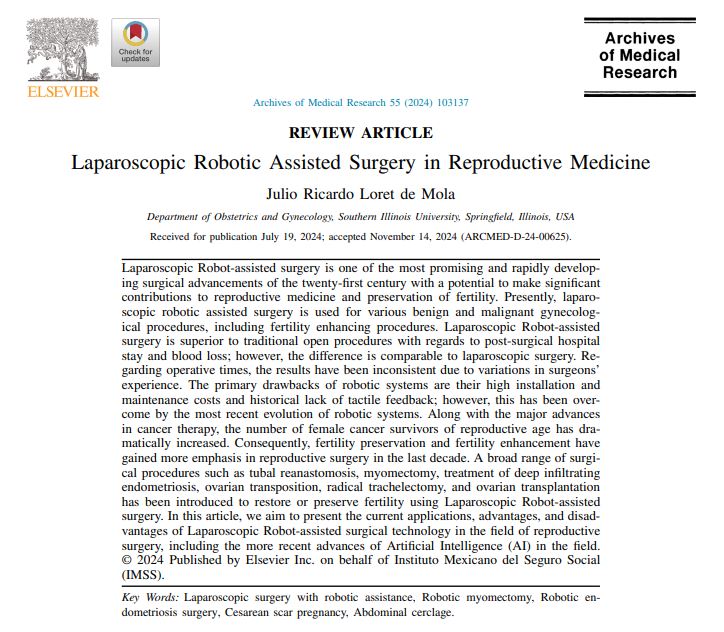 Loret de Mola JR. Laparoscopic Robotic Assisted Surgery in Reproductive Medicine. Arch Med Res. 2024 Dec;55(8):103137.