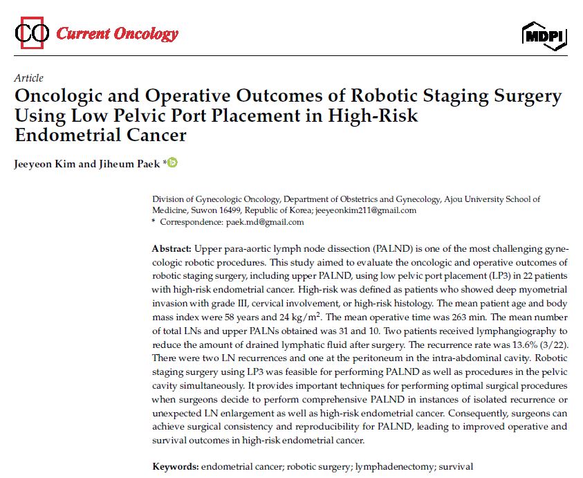 Kim J, Paek J. Oncologic and Operative Outcomes of Robotic Staging Surgery Using Low Pelvic Port Placement in High-Risk Endometrial Cancer. Curr Oncol. 2024 Dec 5;31(12):7820-7827.