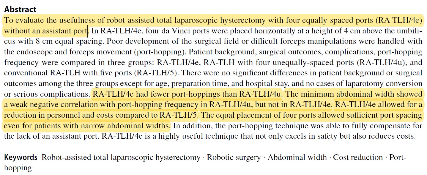 Ito H, Shimomai W, Matsuzaki Y, Suzuki J, Kuroiwa K, Ashizawa N, Yanagida S, Isaka K. Validate robot-assisted total laparoscopic hysterectomy with four equally-spaced ports without an assistant port. J Robot Surg. 2024 Jan 27;18(1):55.