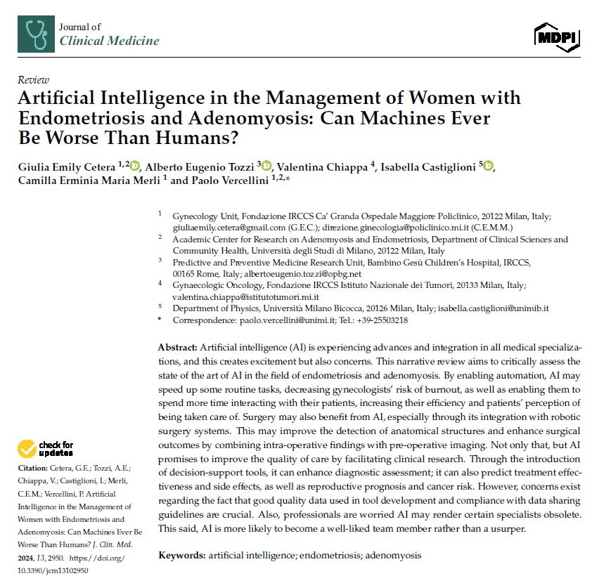 Cetera GE, Tozzi AE, Chiappa V, Castiglioni I, Merli CEM, Vercellini P. Artificial Intelligence in the Management of Women with Endometriosis and Adenomyosis: Can Machines Ever Be Worse Than Humans? J Clin Med. 2024 May 16;13(10):2950.
