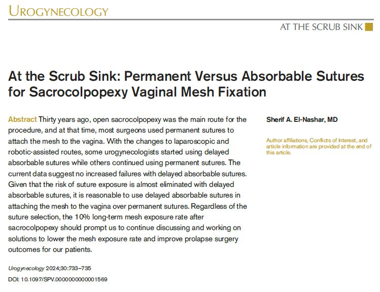 El-Nashar SA. At the Scrub Sink: Permanent Versus Absorbable Sutures for Sacrocolpopexy Vaginal Mesh Fixation. Urogynecology (Phila). 2024 Sep 1;30(9):733-735.