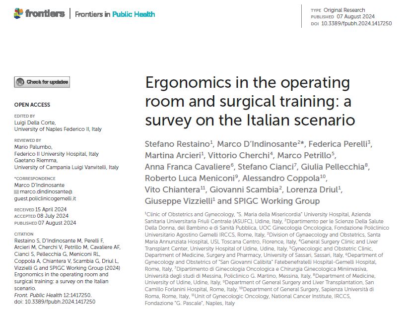 Restaino S, D'Indinosante M, Perelli F, Arcieri M, Cherchi V, Petrillo M, Cavaliere AF, Cianci S, Pellecchia G, Meniconi RL, Coppola A, Chiantera V, Scambia G, Driul L, Vizzielli G; SPIGC Working Group. Ergonomics in the operating room and surgical training: a survey on the Italian scenario. Front Public Health. 2024 Aug 7;12:1417250.