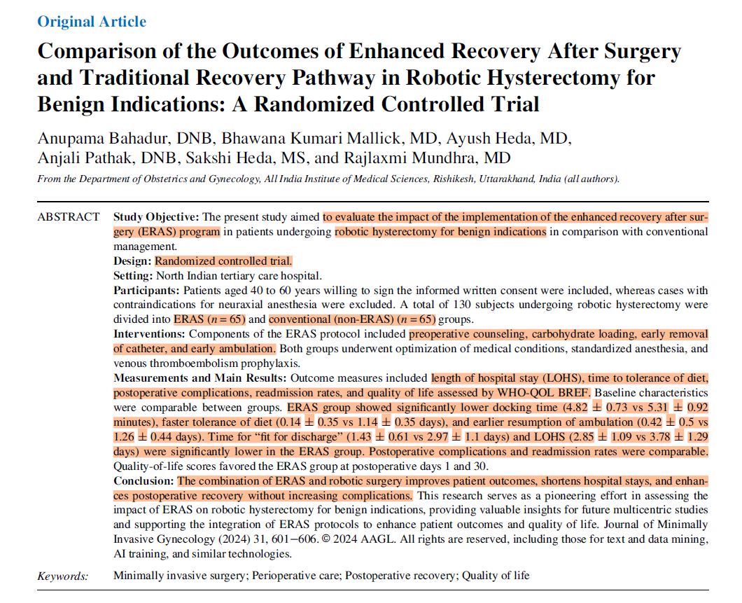 Bahadur A, Mallick BK, Heda A, Pathak A, Heda S, Mundhra R. Comparison of the Outcomes of Enhanced Recovery After Surgery and Traditional Recovery Pathway in Robotic Hysterectomy for Benign Indications: A Randomized Controlled Trial. J Minim Invasive Gynecol. 2024 Jul;31(7):601-606.