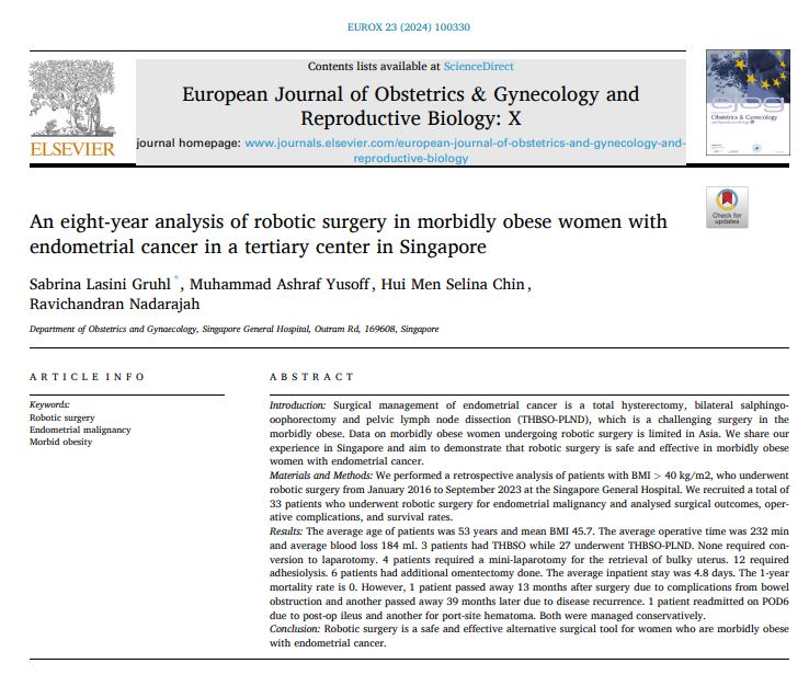 Gruhl SL, Yusoff MA, Chin HMS, Nadarajah R. An eight-year analysis of robotic surgery in morbidly obese women with endometrial cancer in a tertiary center in Singapore. Eur J Obstet Gynecol Reprod Biol X. 2024 Aug 2;23:100330.