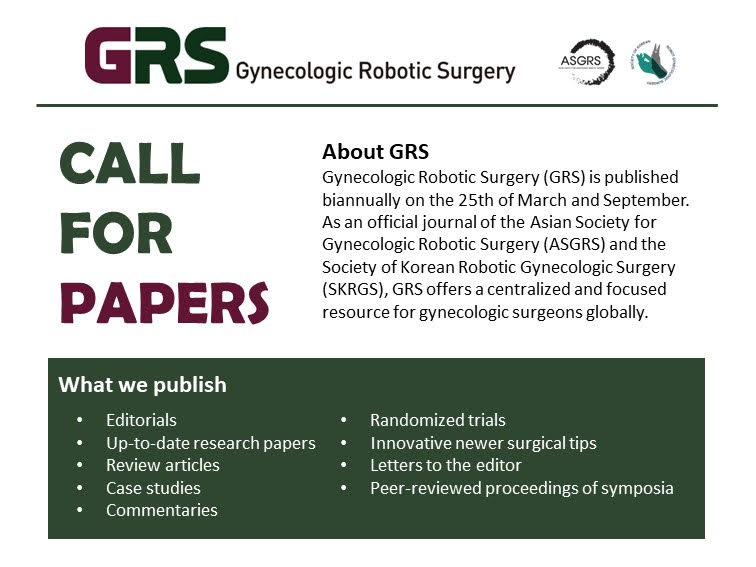 Gynecologic Robotic Surgery (GRS) is seeking submissions for its upcoming issues! As the official journal of the Asian Society for Gynecologic Robotic Surgery (ASGRS) and the Society of Korean Robotic Gynecologic Surgery (SKRGS), GRS provides a centralized and focused resource for gynecologic surgeons globally.
